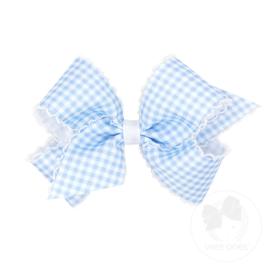 Blue Gingham Printed Grosgrain Hair Bow with Moonstitch Edge