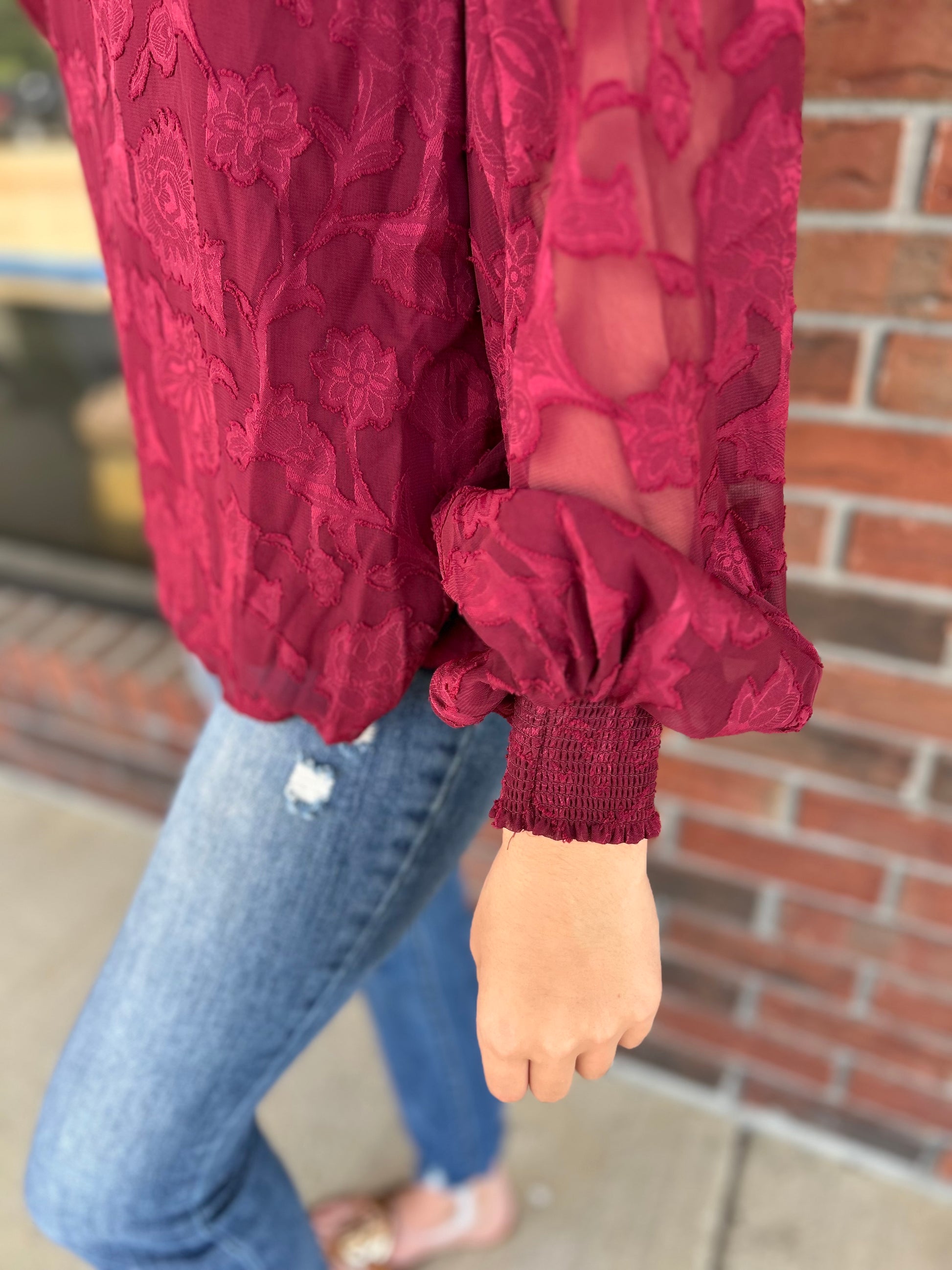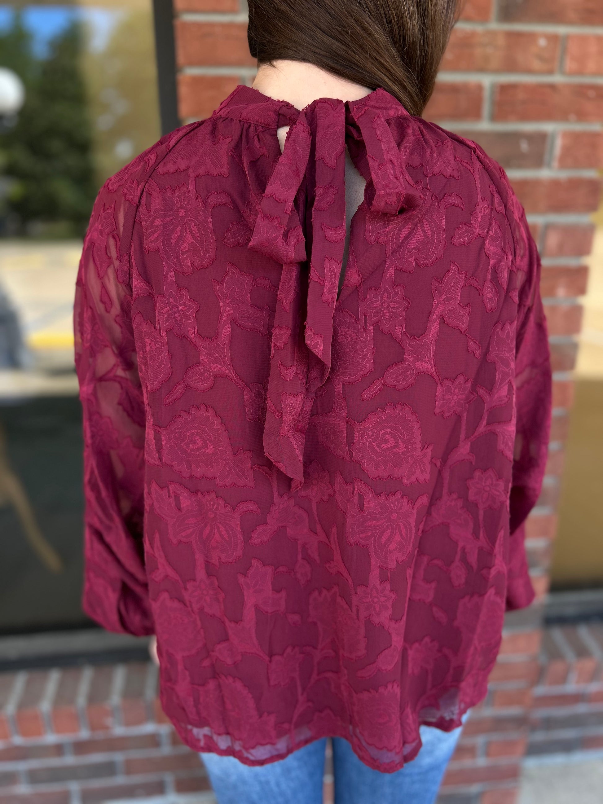 A textured woven top featuring high neckline, raglan sleeve and back neck tie closure Self : 100% Polyester Lining: 100% Polyester Size & Fit -