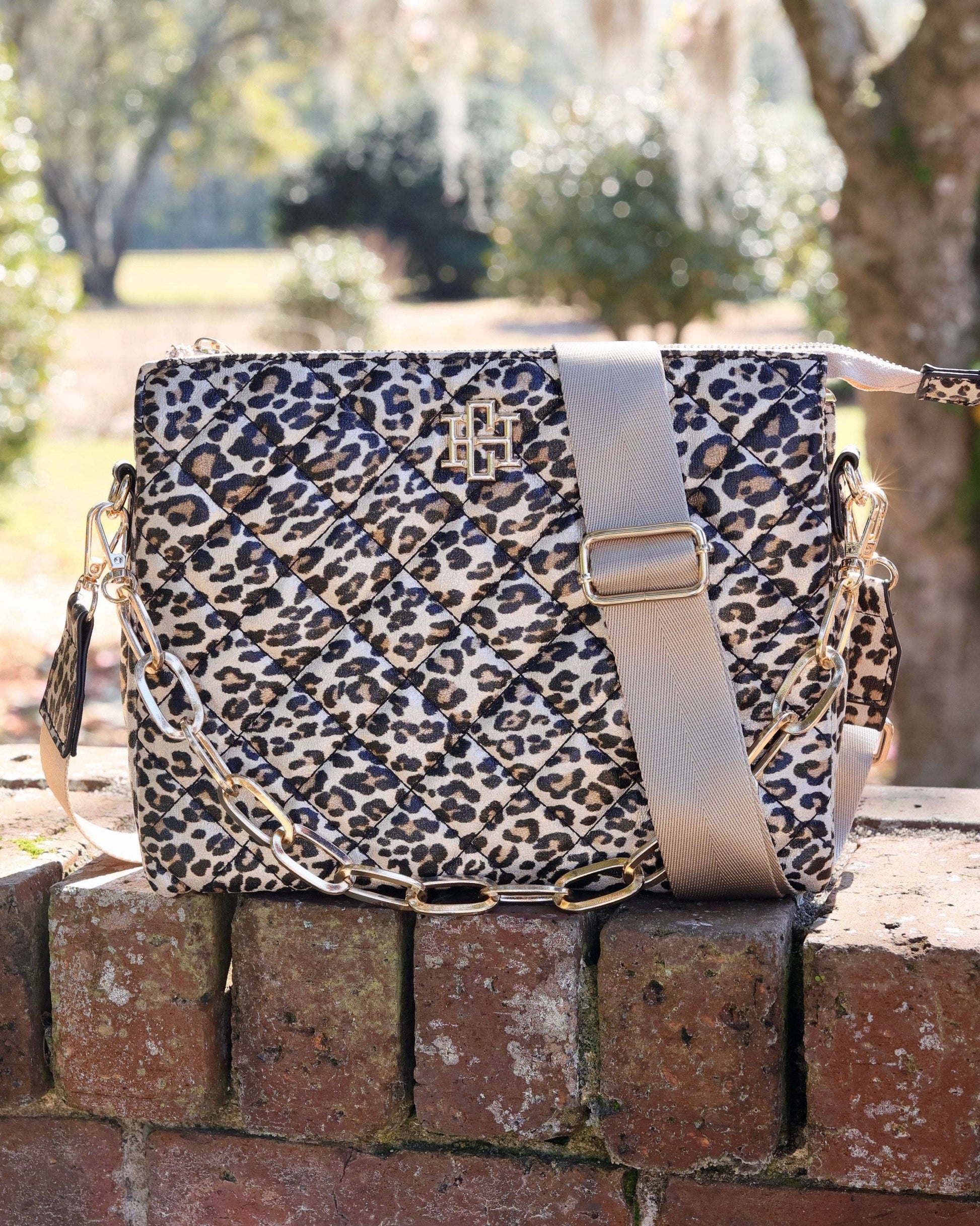 This quilted vegan leather crossbody is so fashion forward! It features a gorgeous leopard print that is oh so soft. It has a chunky gold chain accent that is removable, and it can be used as a carrying strap as well. The crossbody strap is made of nylon and is also adjustable and removable. The top zipper closure leads to two open compartments as well as a third middle zippered section. It also has two smaller internal open pockets and one zippered pocket.