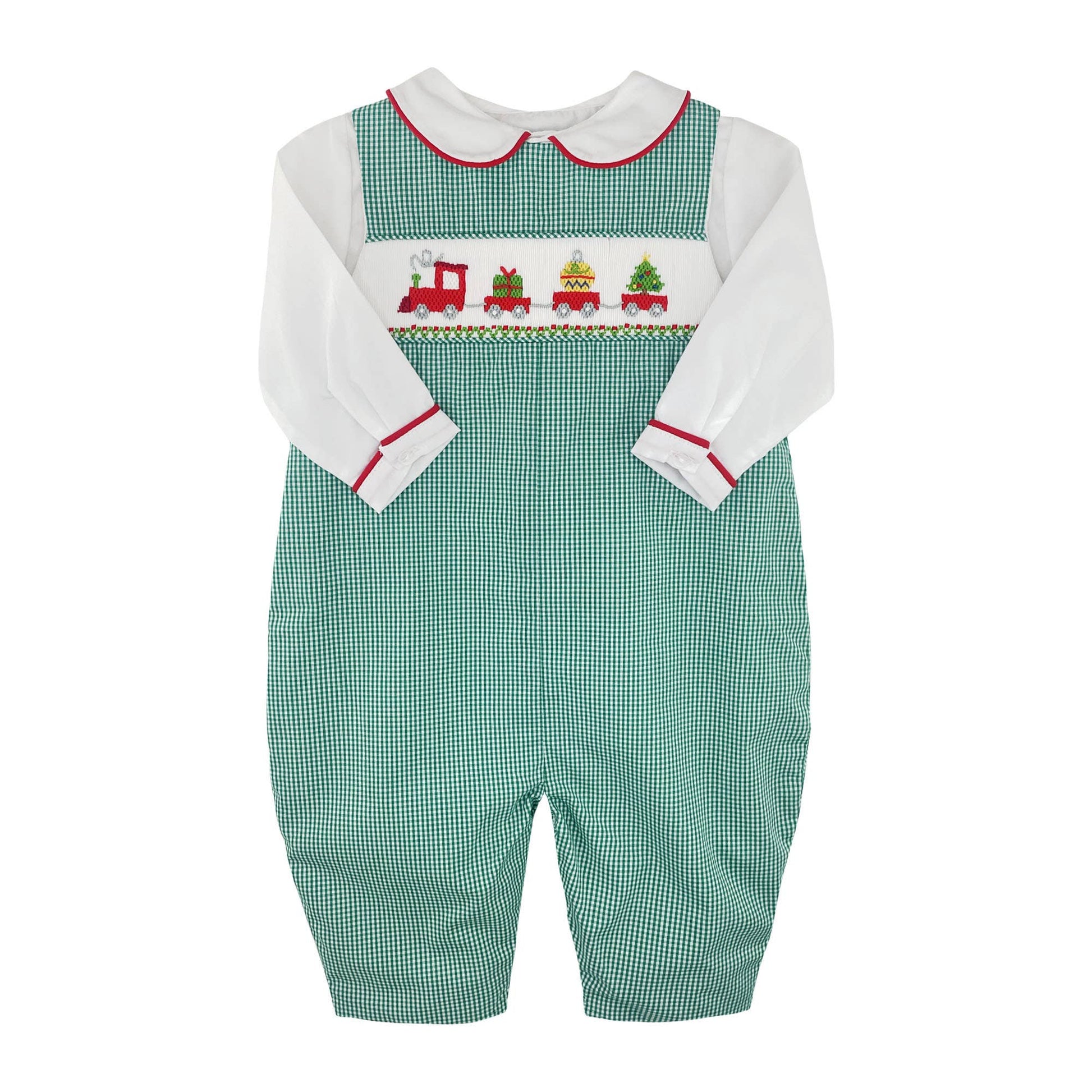 This long sleeve romper comes in a green check fabric with a white peter pan collar with red trim and a hand picture smocked Christmas train design on the front.