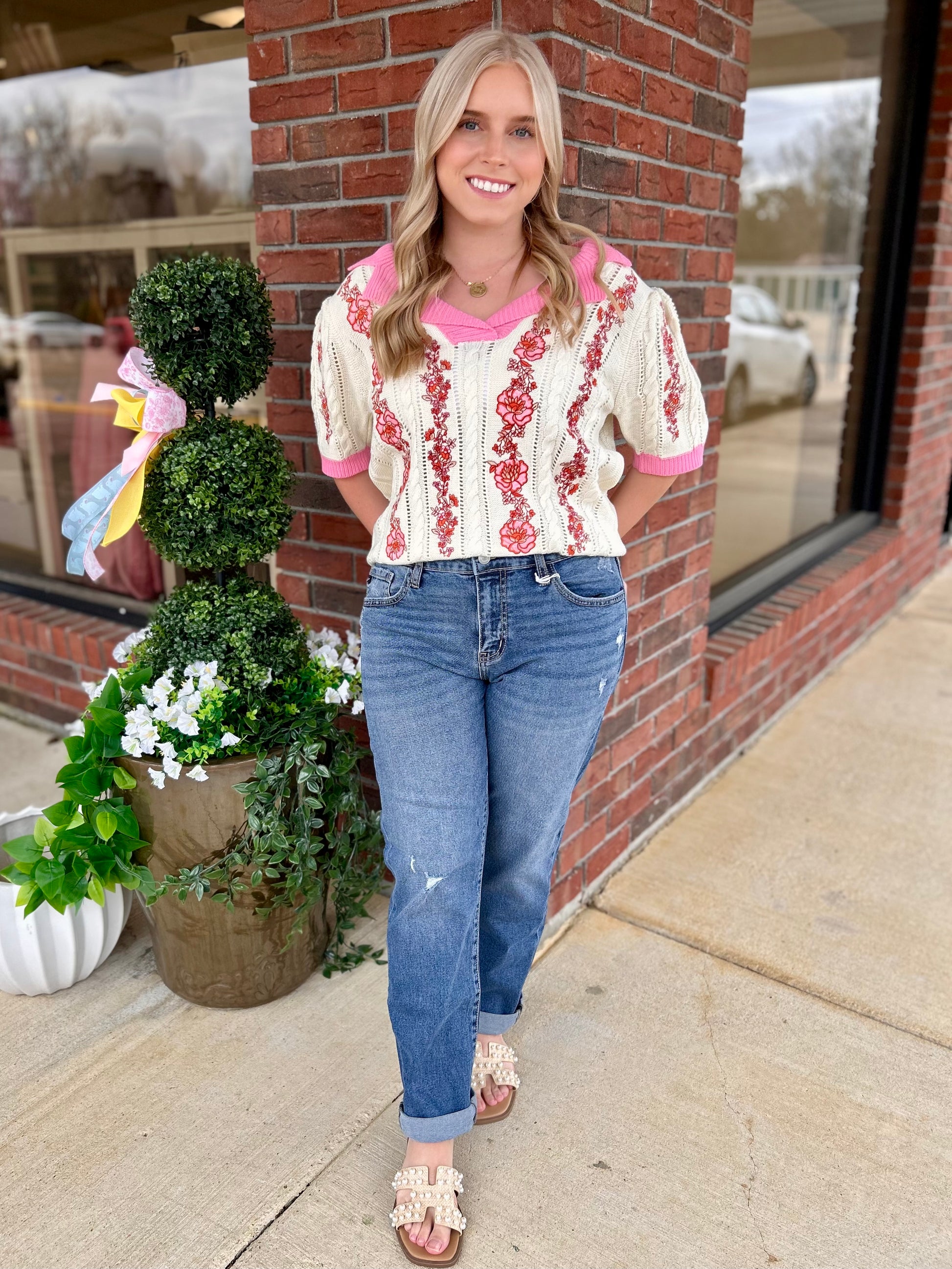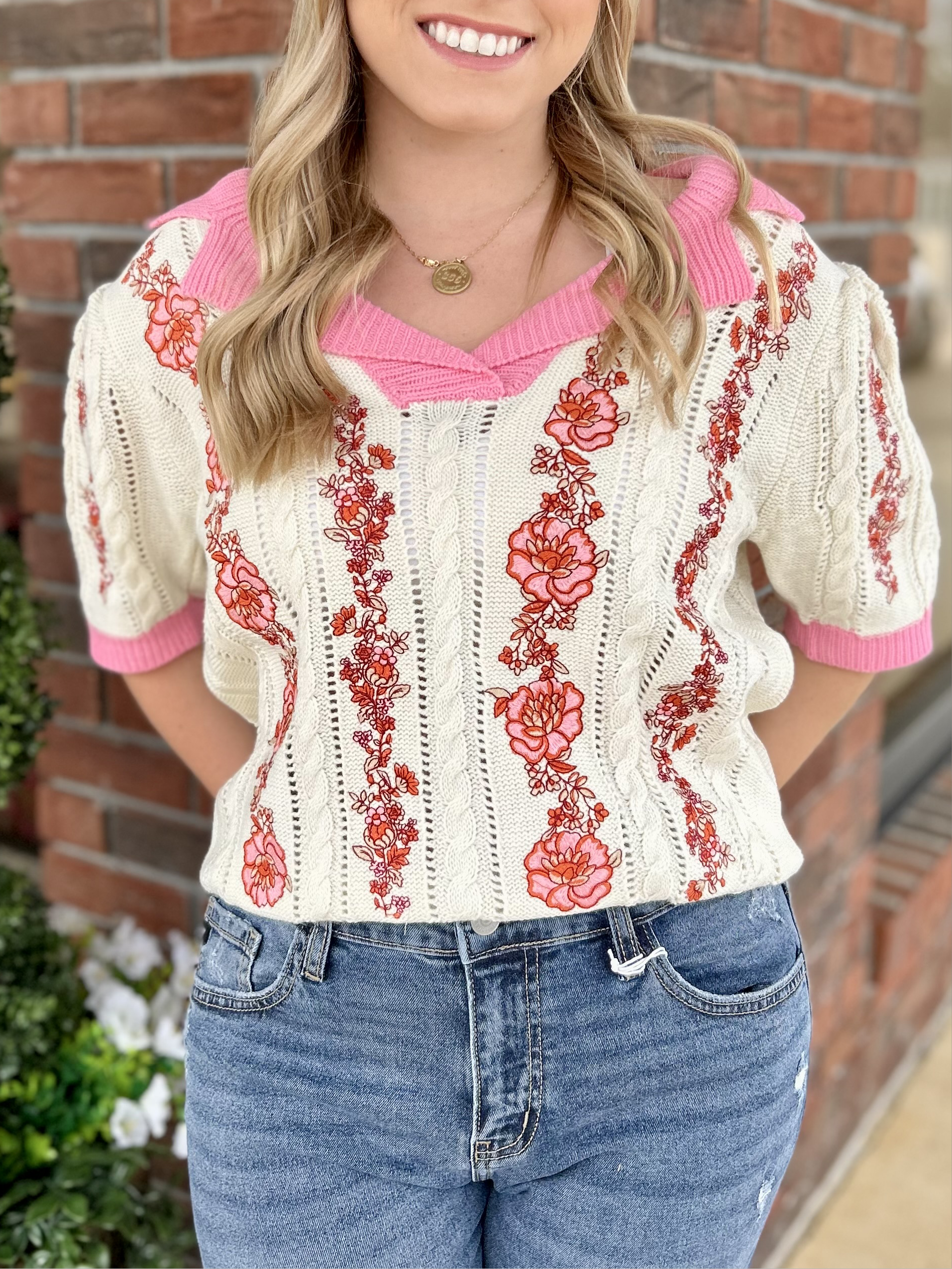 Picture Perfect Floral Embroidery Collared Knit Top