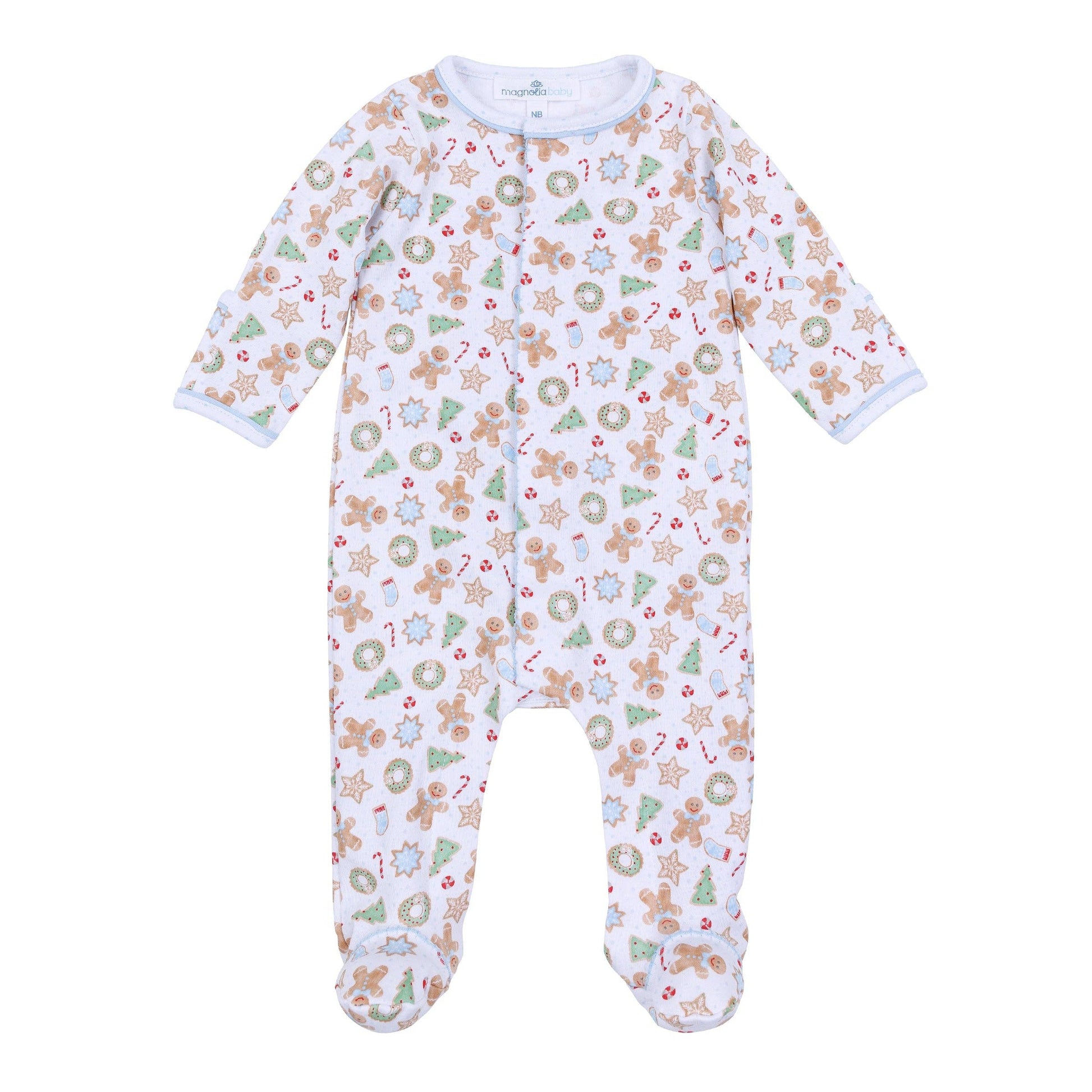 Magnolia Baby - Frosted Wonderland Print Footie - Light Blue Dress your little one in timeless style with this precious footie, crafted from luxurious white Pima Cotton. It features a charming all-over print of gingerbread men and festive shapes, creating a sweet and classic look perfect for the holiday season. Features: * 100% Pima Cotton: Exceptionally soft and breathable for your baby's delicate skin. * Festive All-Over Print: A charming pattern featuring gingerbread girls, stars, and snowflakes. * Snap Closure: Convenient snaps from neck to feet for quick dressing and easy diaper changes. Benefits: * Great Comfort: Ensures a soft and gentle feel for all-day coziness and peaceful sleep. * Timeless Style: A classic design that is always in style, perfect for cherished memories. * Easy Care: Simple to clean, designed for effortless upkeep, making it a parent-friendly choice. * Mix and Match: Coordinates beautifully with other pieces from the Frosted Wonderland collection. A sweet and comfor