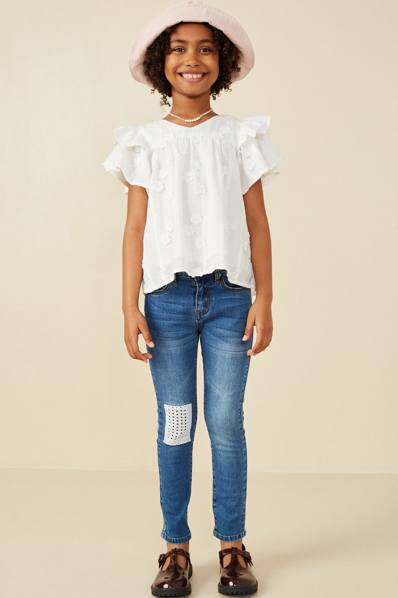 Girls Off White Crochet Floral Detailed Ruffle Sleeve Top