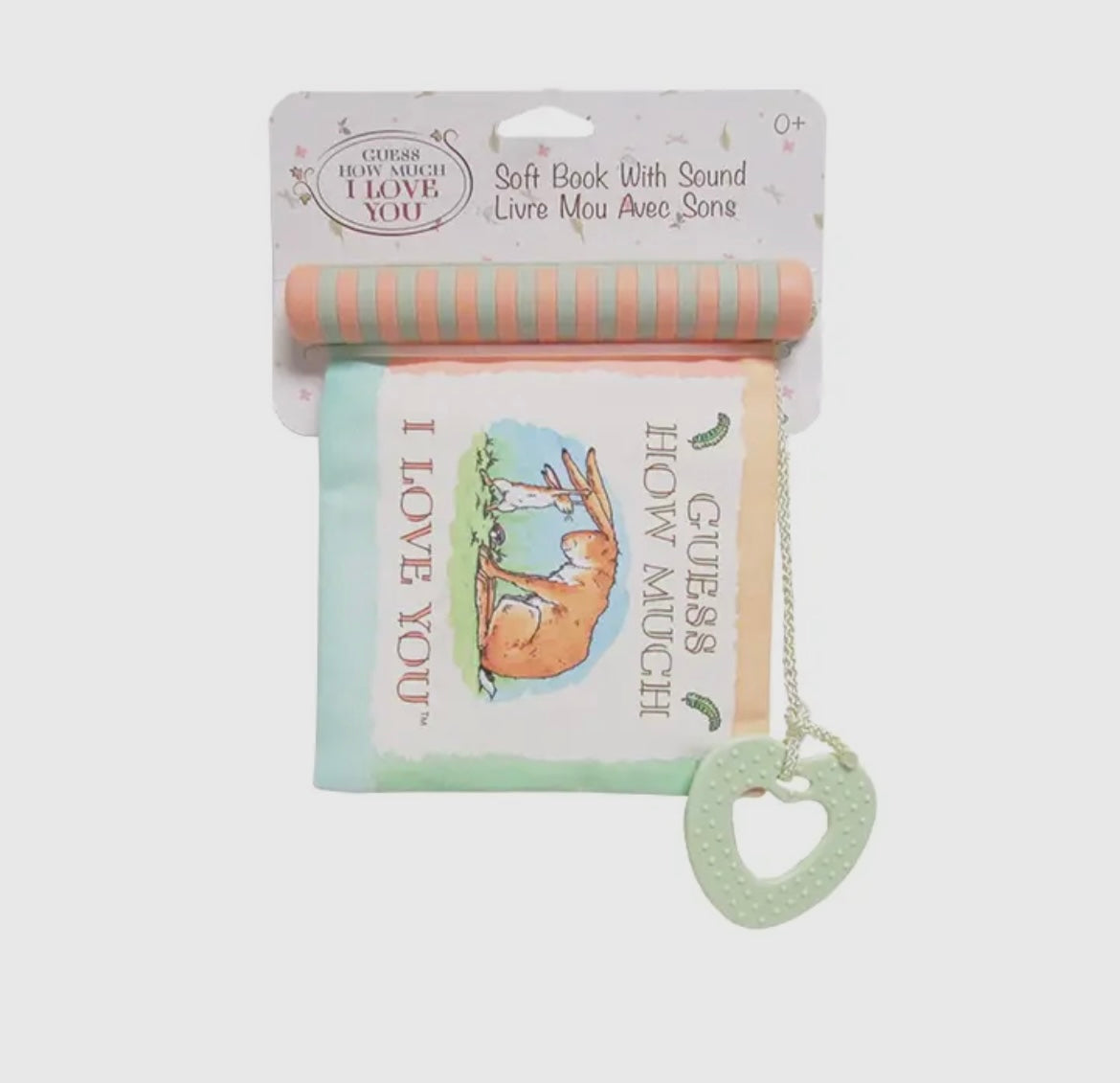 Guess How Much I Love You™ Soft Book is a delightful first book for the nursery or a sweet addition to baby's expanding library. This soft book tells the classic tale and features a 7-inch colorful teether spine and hanging teether heart for soothing tender gums. Awaiting discovery inside is a kissing sound and an audible "I Love You" message! Guess How Much I Love You™ Soft Book measures 6.75 x 1 x 6.50 inches.