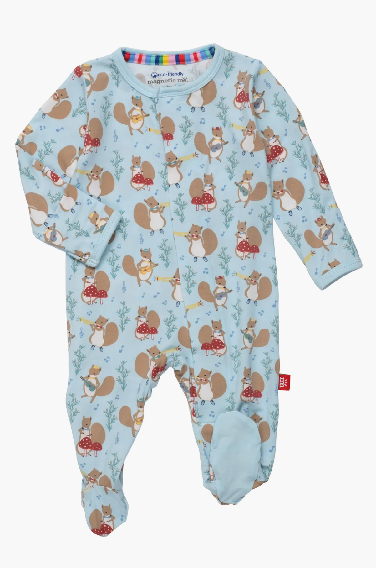 Cheerful critters band together on a cozy footie made with a magnetic closure for easy changing.