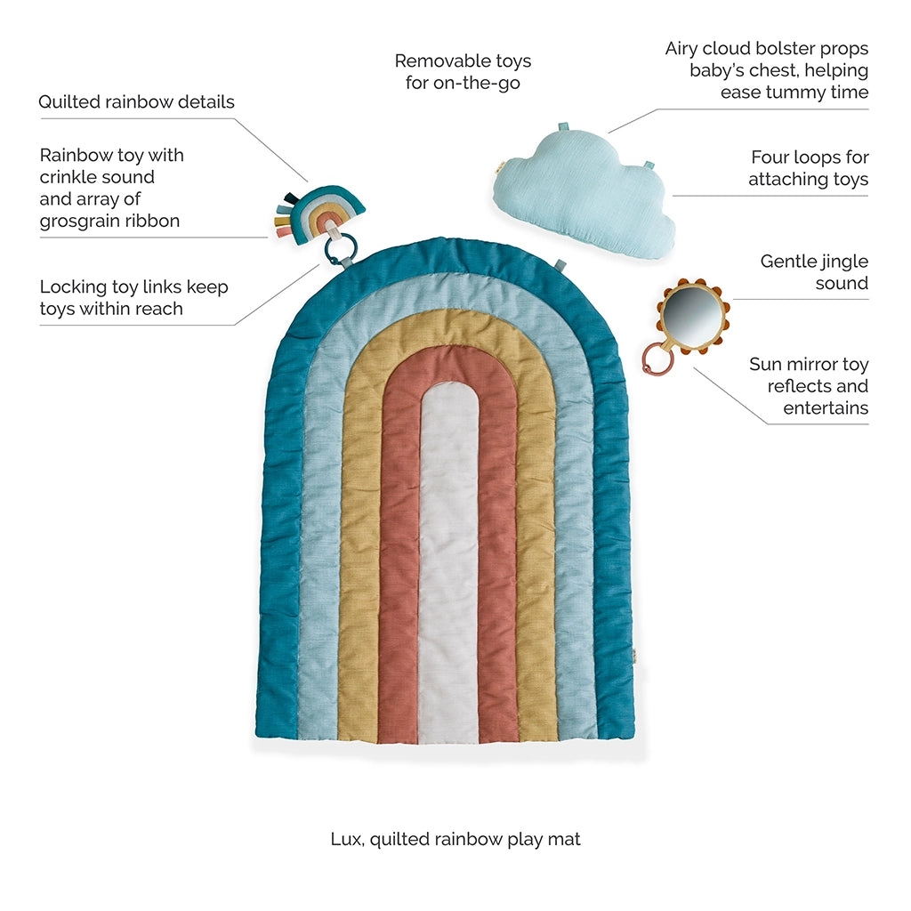 The luxe, quilted rainbow play mat creates a soft play area while the airy cloud bolster provides a boost of support helping baby grow stronger by the day. Watch as your little one gazes at their reflection in the sun mirror while grasping the rainbow’s textured ribbons. The mat folds compactly so you can easily tuck the Ritzy Tummy Time™ into your diaper bag for adventure & playtime on-the-go!