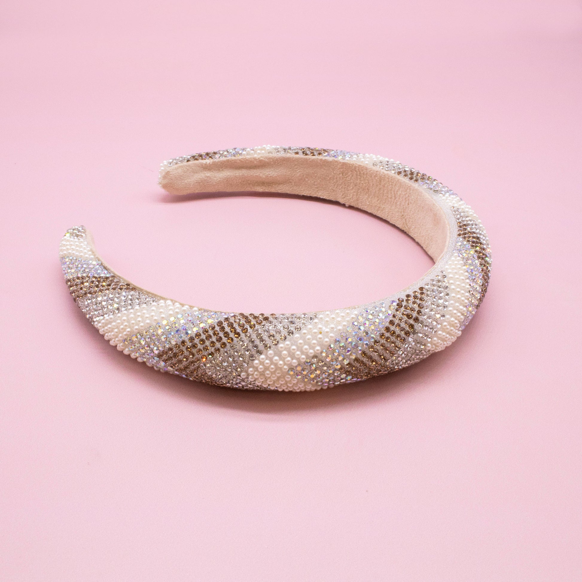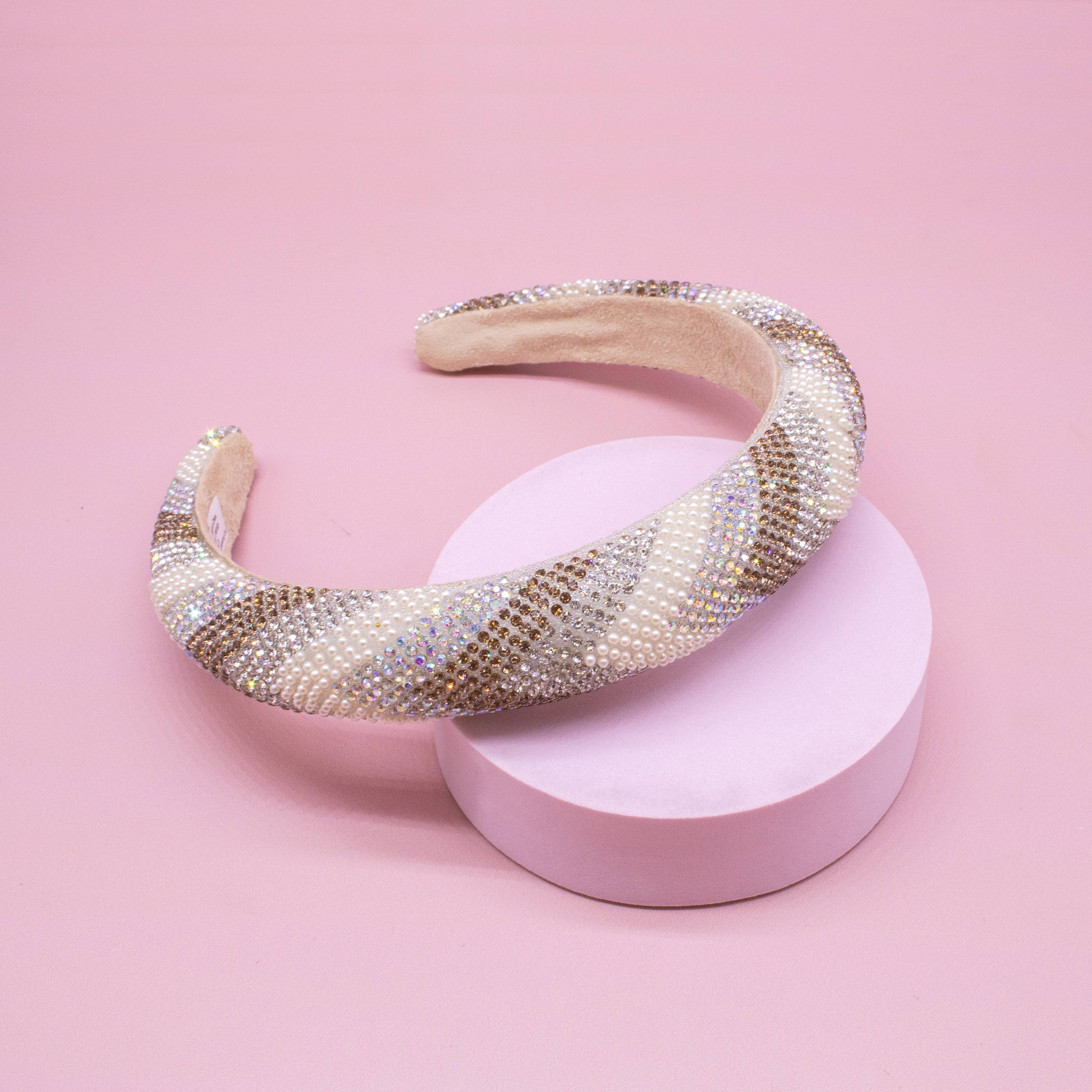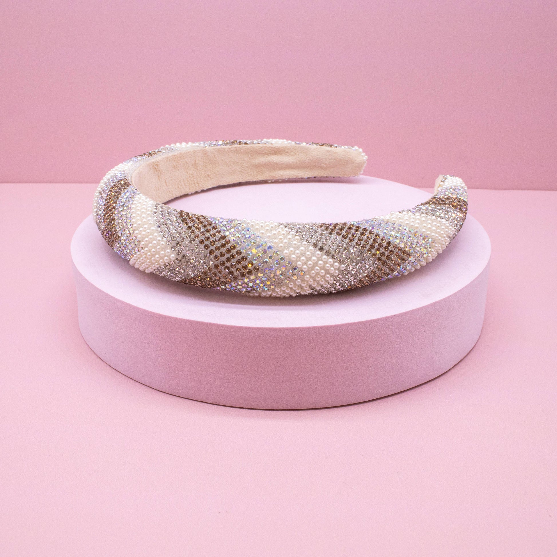 - Chevron design with bronze and silver rhinestones, and white pearl beads