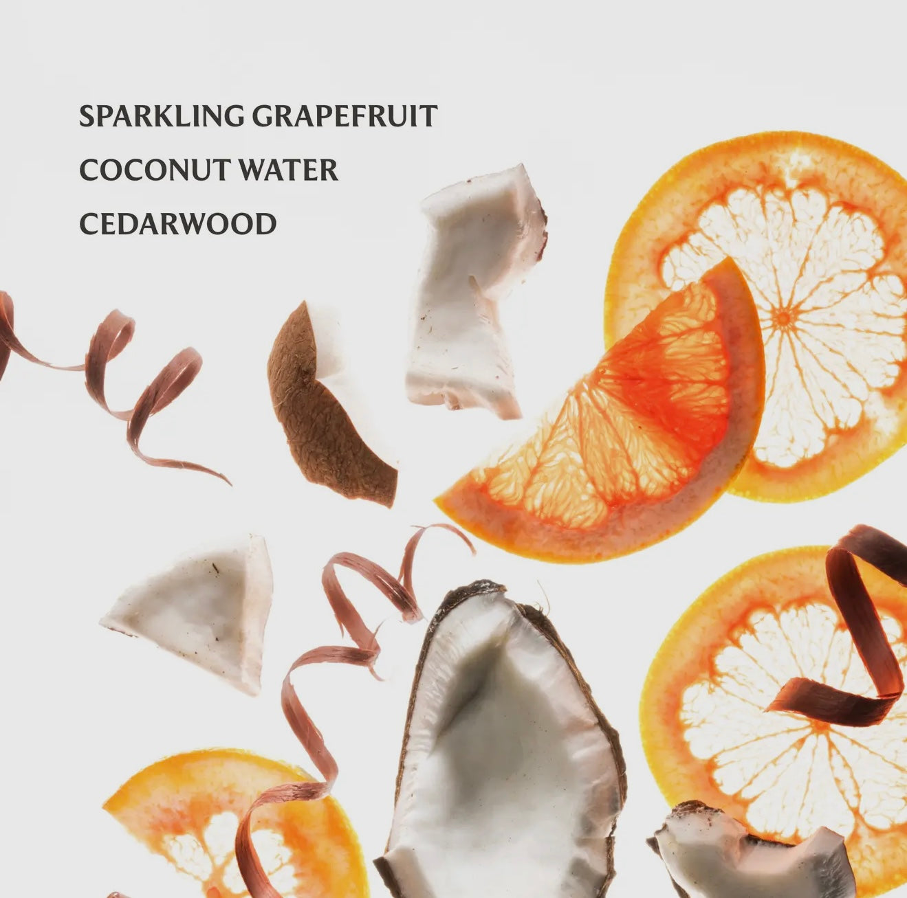 BEACH COCO SCENT: Tropical and fresh. Refreshing coconut water blends with sparkling grapefruit and cedarwood, transporting you to sun-drenched shores.