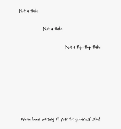 Not a flake Not a flake Not a flip flop flake We've been waiting all year for goodness' sake! In this rhyming plea for snow, a group of youngsters images the cold-weather delights they'll enjoy once winter arrives. Whether at home or away on vacation, little ones love the snowy fun of sledding, skating, build snow figures and snow forts. But once the flakes start to fall, are they in for more than they bargained for? Readers young and old will enjoy this celebration, recall past pleasures, and imagine more to come!